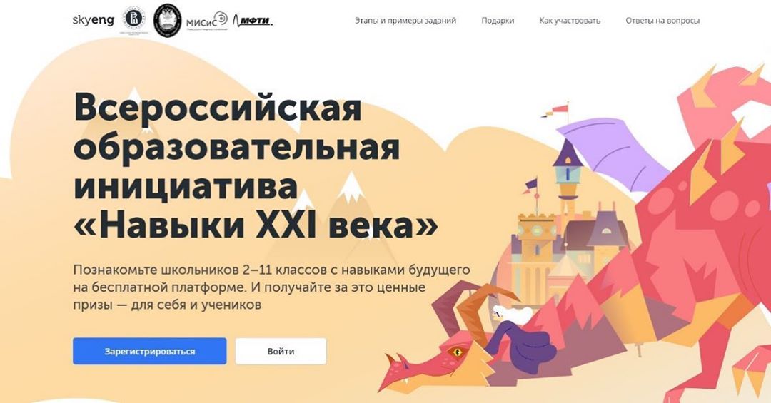 16.10.2019Инициативу запустила крупнейшая в России онлайн-школа английского и математики Skyeng в партнерстве с Московским физико-техническим институтом, Национальным исследовательским технологическим университетом «МИСиС», Нацииональным исследовательским университетом «Высшая школа экономики» и Московским государственным лингвистическим университетом. Участие в онлайн-тестах могут принять ученики со всех регионов России. Во время прохождения “Навыков XXI века” школьники смогут оценить свой уровень владения навыками будущего и получить персональные рекомендации. Инициатива состоит из двух этапов: разминочные тесты на владение навыками 21 века (первый этап) и олимпиада по 3 предметам - английский, математика, информатика (второй этап). Интерактивный формат заданий на онлайн- платформе делает проект увлекательным и доступным не только в рамках школьных уроков, но также в качестве интересной домашней работы.Приглашаем принять участие в масштабном проекте. Регистрируйтесь, участвуйте, побеждайте и выигрывайте ценные призы! Желаю всем удачи!