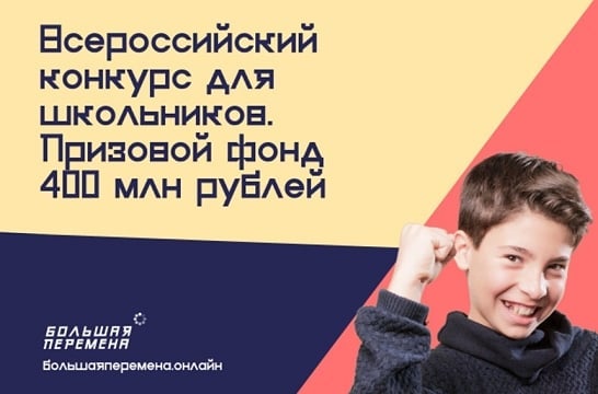 Всероссийский конкурс «Большая перемена», который проходит при поддержке Министерства просвещения Российской Федерации, стартовал 28 марта и продлится до октября 2020 года. Регистрация участников открыта на сайте «БольшаяПеремена.онлайн» до 23 июня, очные этапы конкурса начнутся с 20 июля 2020 года.