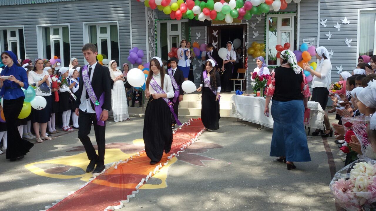 Выпускники 8 класса принимали теплые поздравления от учителей, родителей, первоклассников и почетных гостей. Мероприятие открыл государственный гимн Российской Федерации, после которого выступил первый класс и выпускной класс начальной школы. Выпускники нашей школы, восьмиклассники, выразили свою благодарность всем педагогам школы, которые все восемь лет шагали с ними, после чего выступила директор школы П.Д.Басаева с поздравлениями и пожеланиями выпускникам и тем школьникам, которые после каникул вернутся в родную школу. Затем Шамаева М.И. наградила учащихся памятными письмами и грамотами за прекрасную успеваемость в школе.По окончании линейки прозвенел последний звонок,право дать его предоставили выпускнику 8 класса Юсупову Мусе и ученице 1 класса Халдыхароевой Хаве.
