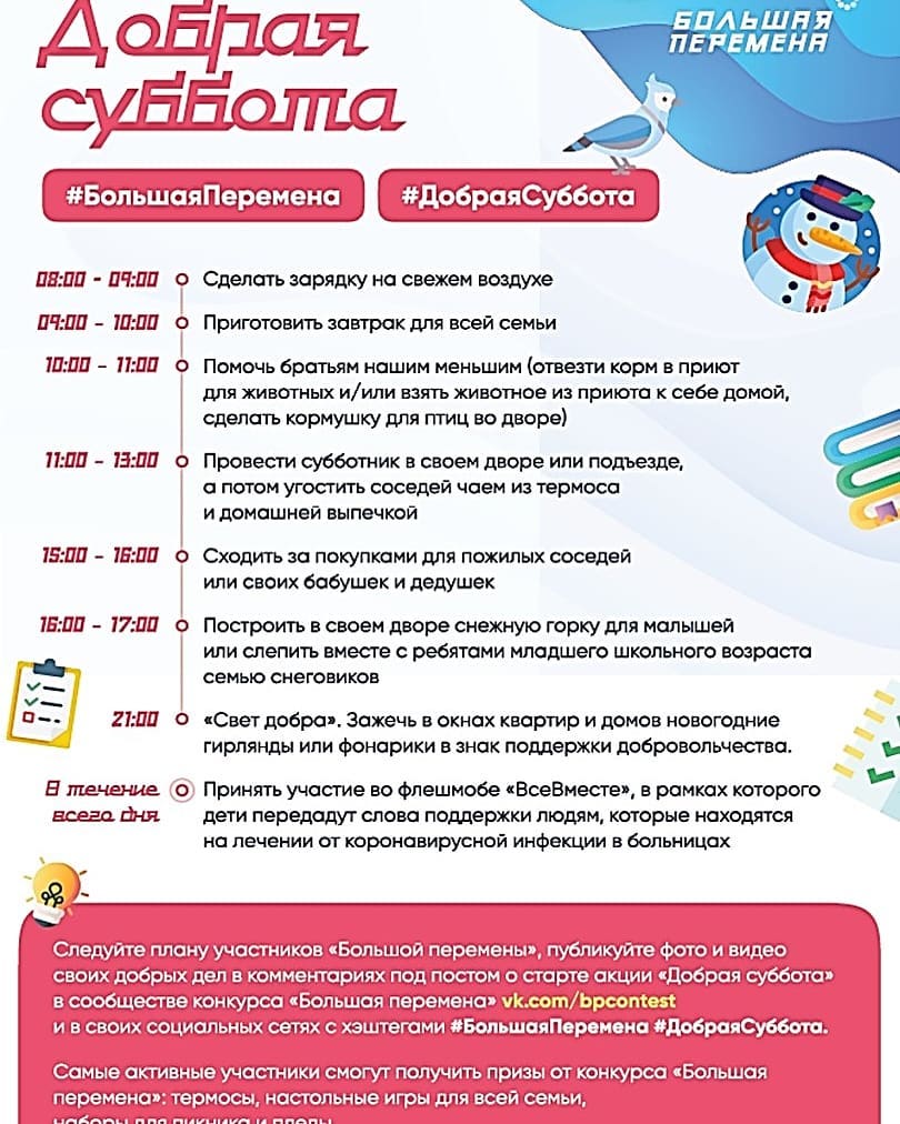 22 января 2021 года в сообществе Всероссийского конкурса для школьников «Большая перемена» социальной сети ВКонтакте (https://vk.com/bpcontest) стартует Всероссийская акция «Добрая суббота». Инициаторами акции выступили участники «Большой перемены», они предложили всем школьникам и их родителям начать новый год с добрых дел и полезных привычек.
