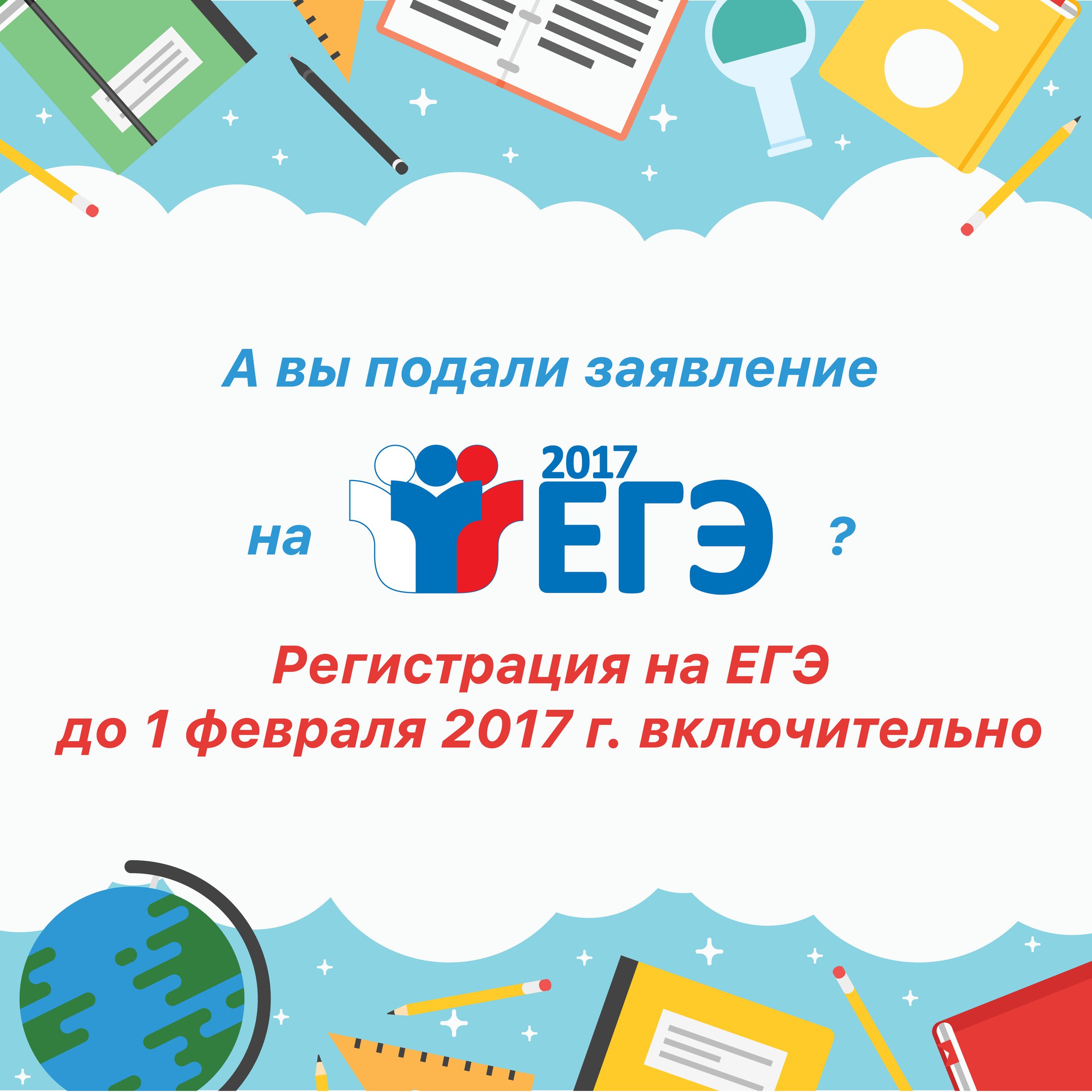 Федеральная служба по надзору в сфере образования и науки напоминает, что заявление на участие в ЕГЭ 2017 года необходимо подать до 1 февраля (включительно)
