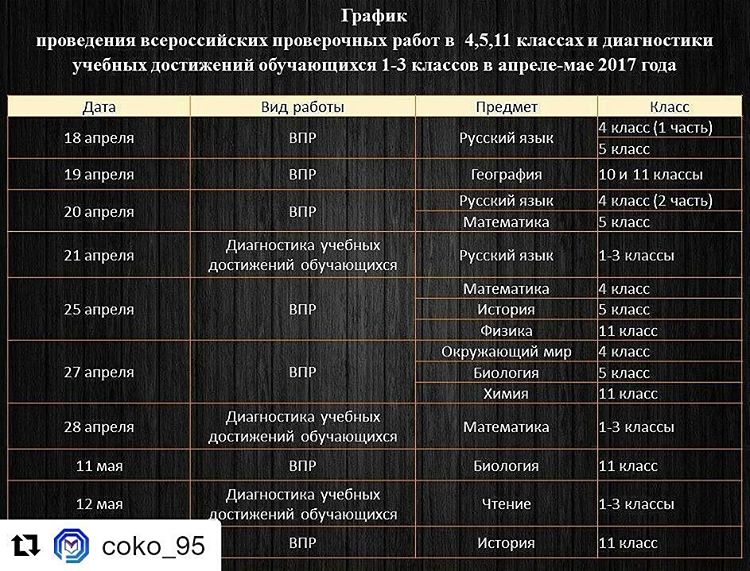 График проведения всероссийских проверочных работ в 4,5,11 классах и диагностики учебных достижений обучающихся 1-3 классов в апреле в мае 2017 года