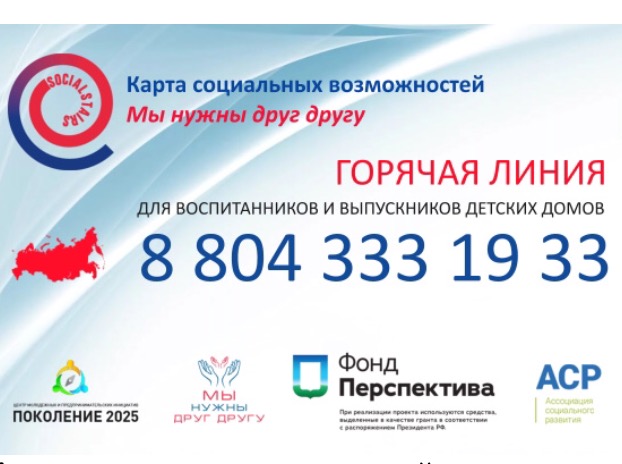 Карта социальных возможностей  - это масштабный, федеральный проект для воспитанников и выпускников детских домов. Проект реализует Центр молодежных и предпринимательских инициатив "ПОКОЛЕНИЕ 2025 при поддержке АНО "Мы нужны друг другу".