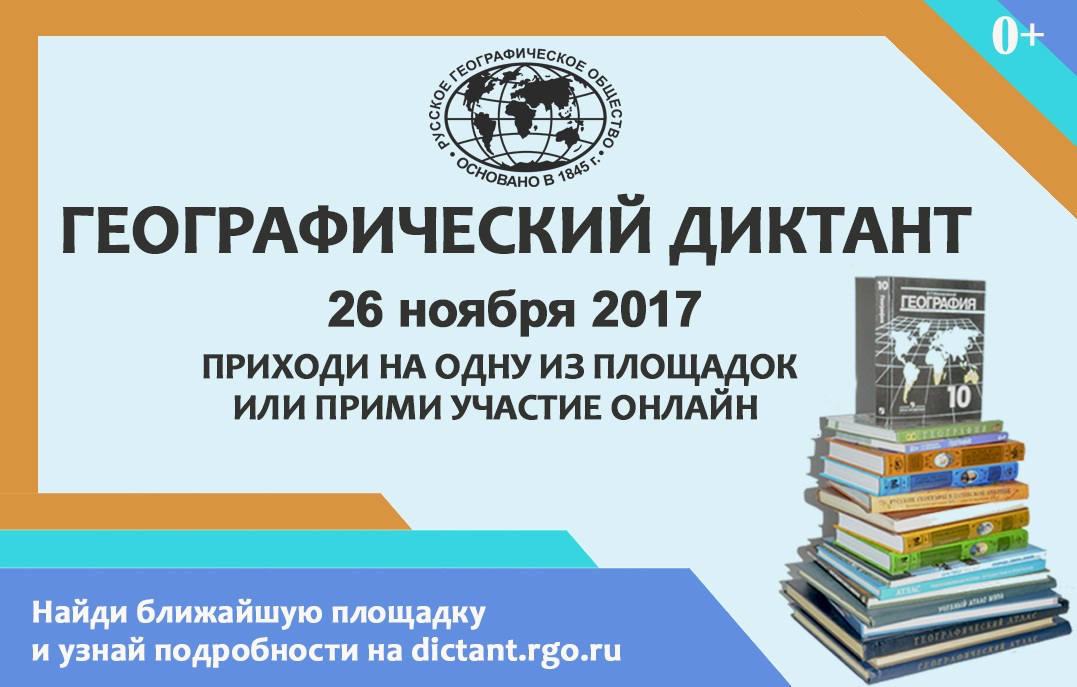 26 ноября 2017 года в 12.00 по местному времени во всех субъектах Российской Федерации состоится Всероссийский географический диктант. Образовательная акция, организованная Русским географическим обществом (РГО) по инициативе Председателя Попечительского совета РГО, Президента Российской Федерации Владимира Путина, пройдёт в России в третий раз. Главной задачей акции станет независимая оценка географической грамотности населения, мотивация граждан к изучению географии России.