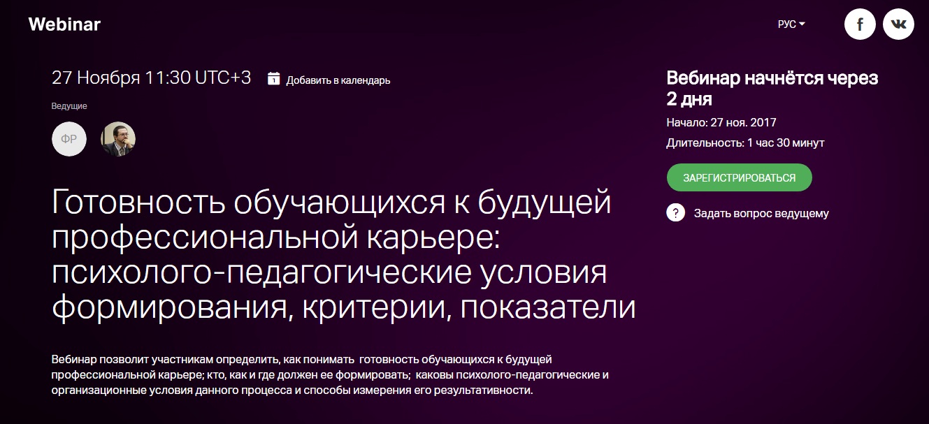 Вебинар позволит участникам определить, как понимать готовность обучающихся к будущей профессиональной карьере; кто, как и где должен ее формировать; каковы психолого-педагогические и организационные условия данного процесса и способы измерения его результативности.