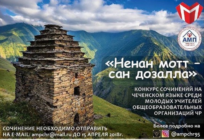 10.04.2018Продолжается прием работ на конкурс сочинений на чеченском языке «Ненан мотт – сан дозалла» среди молодых учителей общеобразовательных организаций республики, приуроченный ко Дню чеченского языка, который отмечается ежегодно 25 апреля. Организатор конкурса Ассоциация молодых педагогов Чеченской Республики (@ampchr95) при поддержке Министерства образования и науки ЧР.Конкурс проводится в целях популяризации чеченского языка, повышения интереса молодежи к изучению родного языка, содействия развитию творческого потенциала молодых учителей, повышения эффективности преподавания чеченского языка.Условия конкурса смотрите на официальной странице АМП ЧР в Инстаграм и Mylistory @ampchr95.