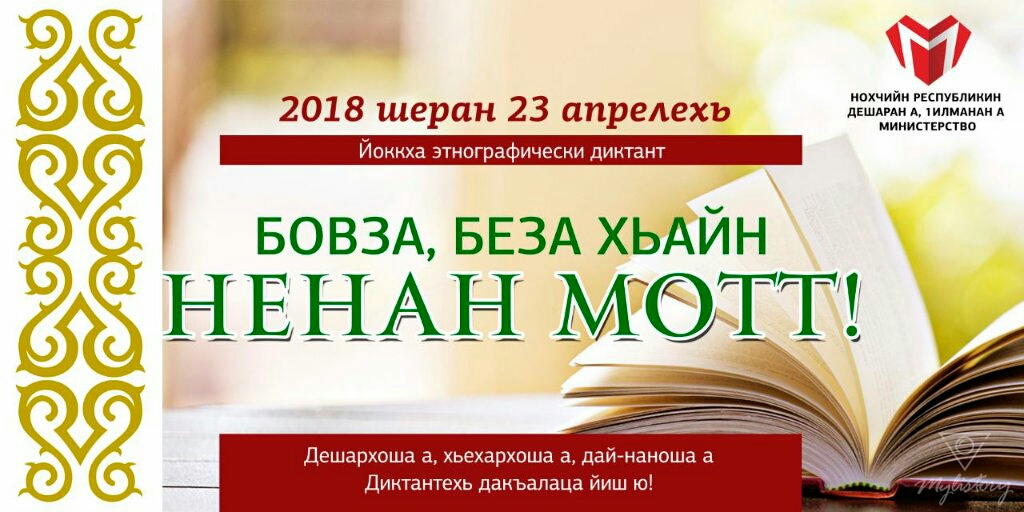 13.04.20182018 шеран 23 апрелехь Нохчийн республикан дешаран а, Iилманан а Министерствос д1ахьур ю нохчийн меттан Денна лерина Йоккха этнографический диктант " Бовза, беза хьай ненан Мотт!" Диктант д1аяхьа аьтто кхоллар т1ехь ду (т1едиллина) Нохчийн Республикан массо а дешаран организацешна.